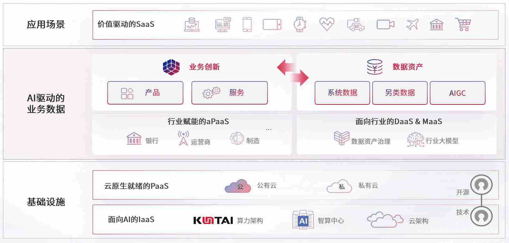 数字时代,,,围绕企业数字化转型的关键要素,,尊龙旗舰厅数码开创性的提出数云融合战略和技术体系框架,,,着力在云原生、、、数字原生、、、、AI原生和信创产业上架构产品和服务能力,,,,为处在不同数字化转型阶段的快消零售、、汽车、、、、金融、、、医疗、、政企、、、、教育、、、运营商等行业客户提供泛在的敏捷IT能力和融合的数据驱动能力,,构建跨界融合创新的数字业务场景和新业务模式,,,,助力企业级客户建立面向未来的核心能力和竞争优势,,,,全面推动社会的数字化、、、智能化转型升级。。。