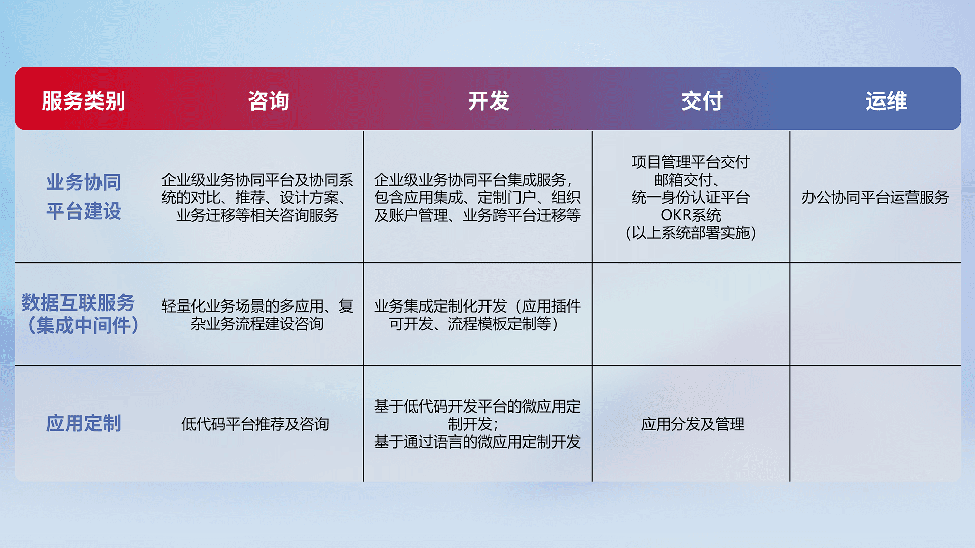 针对钉钉、、企微、、IDaas等平台级产品提供产品的规划、、方案、、、、交付、、、、定制化开发等服务,,,,实现如统一协同办公、、、智能客户服务、、混合会议管理、、、智能数据查询、、等业务场景,,,,实现数字化转型。。