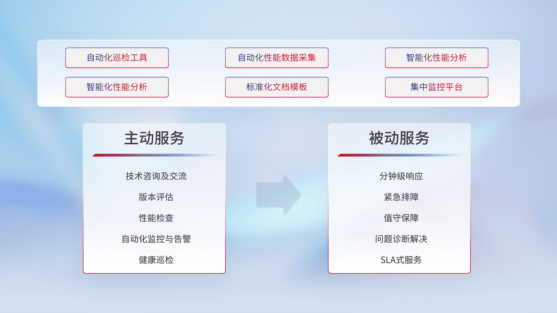 智能化工具和标准化文档,,,,保障服务质量,,,提供主动服务(包含技术咨询、、、版本评估、、性能检查、、、、自动化监控与告警、、、、健康巡检)和被动服务包含(分钟级响应、、、紧急排障、、、、值守保障、、、、问题诊断解决、、SLA服务)。。。。