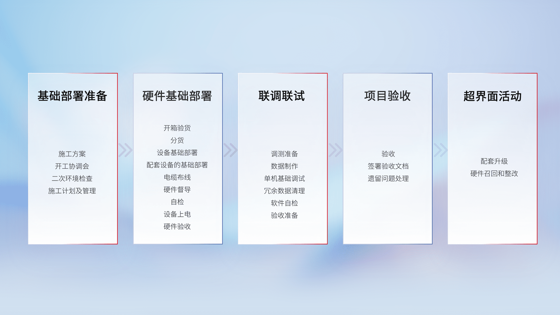 从基础部署准备、、硬件基础部署、、、、联调联试、、、、项目验收、、、、越界面活动的全过程可追溯,,,保证施工质量和进度。。。。